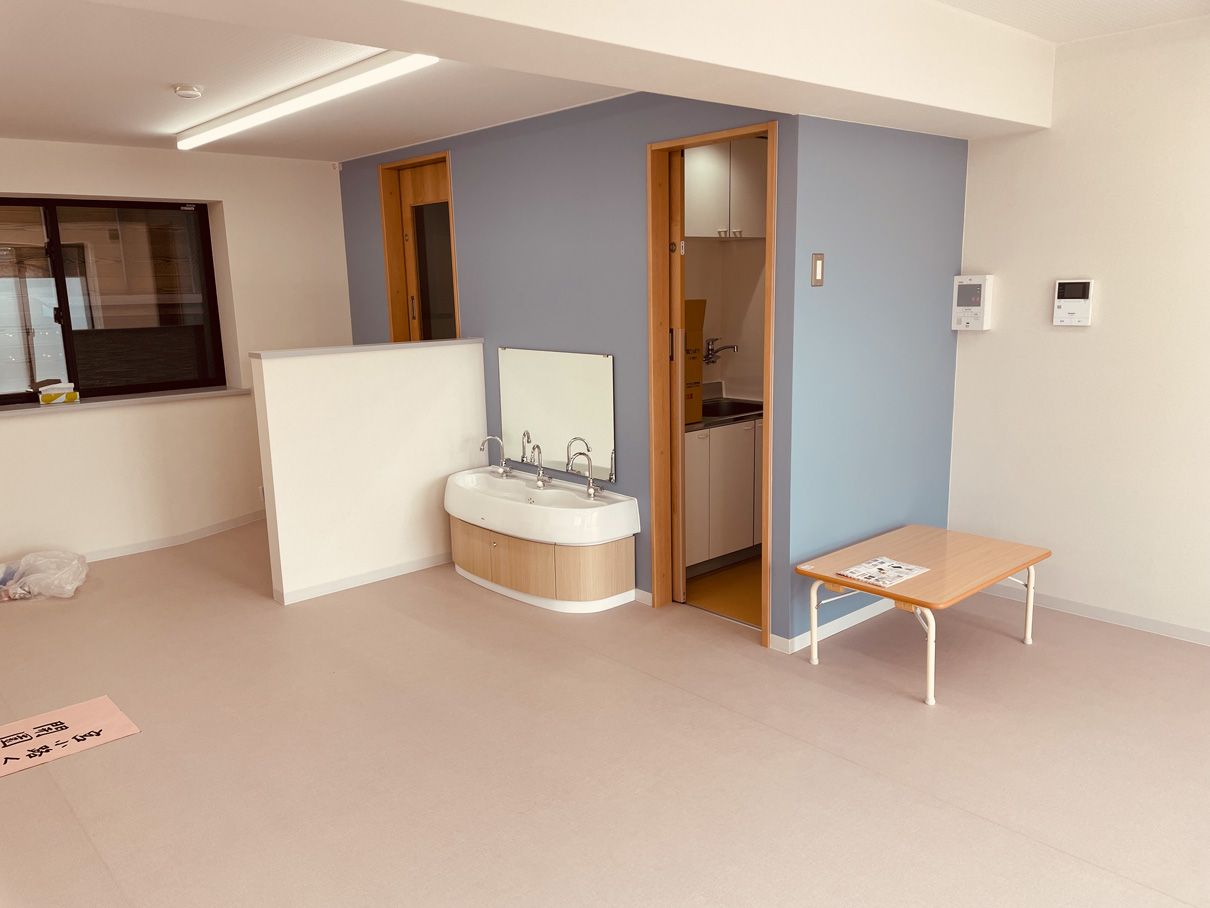 やわらかい色合いの床や壁面、子どもたちが使いやすい高さに設置された手洗い場など、
